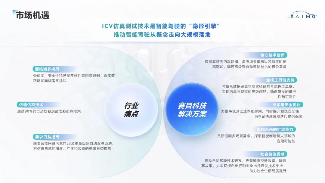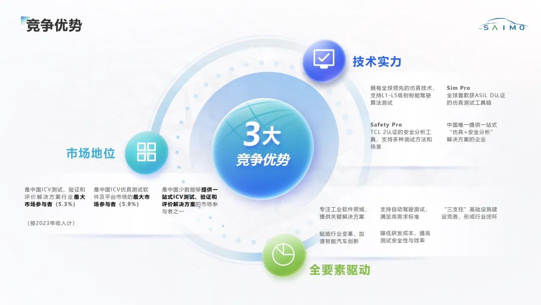 據(jù)介紹,智能網(wǎng)聯(lián)汽車(ICV)仿真測試領(lǐng)域具有廣闊的市場前景。根據(jù)弗若斯特沙利文數(shù)據(jù),中國ICV行業(yè)市場規(guī)模預(yù)計(jì)從2023年的1653億元增長至2030年的6596 億元,年均復(fù)合增長率約20.1%;其中ICV 測試、驗(yàn)證和評價(jià)解決方案行業(yè)市場規(guī)模將以 33.6%的年均復(fù)合增長率增長至279億元。賽目科技致力于解決行業(yè)關(guān)鍵痛點(diǎn),并持續(xù)創(chuàng)新,為行業(yè)提供全面的工具鏈解決方案。工具鏈以Sim Pro(仿真平臺)和Safety Pro(綜合安全分析工具)為核心,兩款產(chǎn)品已通過ISO 26262標(biāo)準(zhǔn)的功能安全認(rèn)證,成為賽目科技技術(shù)壁壘和利潤增長點(diǎn)的重要組成部分。憑借技術(shù)優(yōu)勢和市場前瞻性,賽目科技正成為智能駕駛從概念邁向規(guī)?;涞氐摹半[形引擎”,也是這一高速增長中的最大受益者。