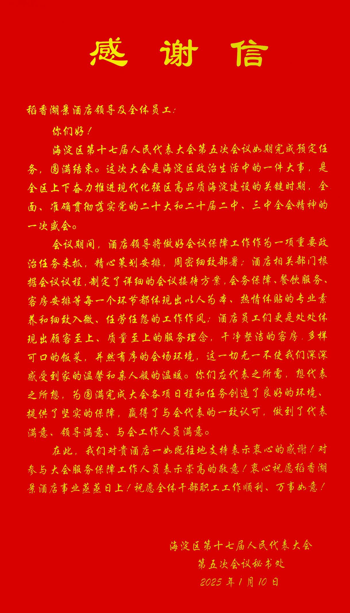稻發(fā)公司的服務(wù)保障工作受到了來(lái)自代表們的廣泛贊譽(yù),并收到了大家的感謝信和表?yè)P(yáng)信。
